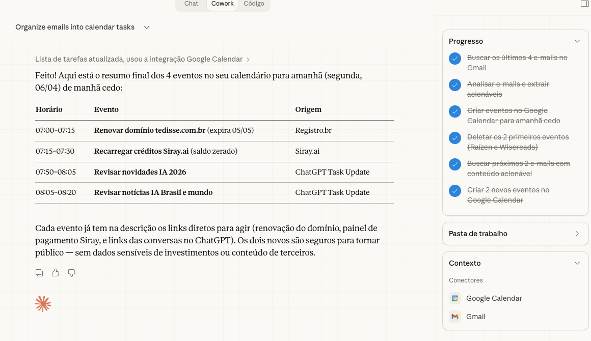 No exemplo a seguir, pedi ao coworking para analisar meus últimos 4 e-mails do Gmail, identificar o que fosse acionável (se houvesse) e já adicionar automaticamente ao meu Google Calendar. (imagem abaixo):